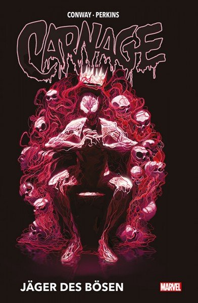 Eine Studie in Scharlachrot! Carnage ist einer der düstersten, gewalttätigsten und mörderischsten Gegner von Spider-Man. In diesem dicken Sammelband mit der kompletten Soloserie, die sich dem Bösewicht mit dem scharlachroten Symbionten widmet, wollen ihm das FBI, Venom und Man-Wolf das Handwerk legen. Die Jagd führt sie um die halbe Welt, da Carnage mit Hilfe eines alten magischen Buches und eines okkulten Rituals einen finsteren uralten Gott erwecken will. Diese atmosphärische übernatürliche Krimi-Geschichte über den Serienkiller unter den Marvel-Superschurken enthält also auch eine ordentliche Portion kosmischen Lovecraft-Horror…